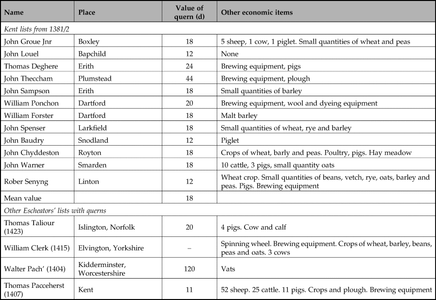 Querns were not only associated with the grinding of wheat, and the Escheators’ records from northern Kent, largely associated with small towns, provide an alternative perspective. These typically occur alongside brewing equipment, rather than the agricultural produce and tools found in lists from the southern and eastern parts of the county (Table 1). These querns were probably used for grinding malt, either the product of the household or acquired commercially. Brewing, like handmilling, is an activity commonly associated with women. Judith Bennett's (Reference Bennett1996) analysis shows that in the fourteenth century the brewing industry was dominated by small-scale female brewsters, but by the sixteenth century it was largely in the hands of male specialists. Interpreting this pattern, Bennett proposes that as brewing became more profitable, and opportunities for entrepreneurship emerged in the post-Black Death economy, women became marginalized, forcing them to adapt and find new ways of contributing to household income (Bennett Reference Bennett1997). Whether used for grinding grain or in brewing, as commerce intensified querns provided new possibilities for domestic labour and household economy, yet at the same time, the forms of domestic becoming in which they were implicated were precarious, with a range of contextual factors determining their ability to endure.