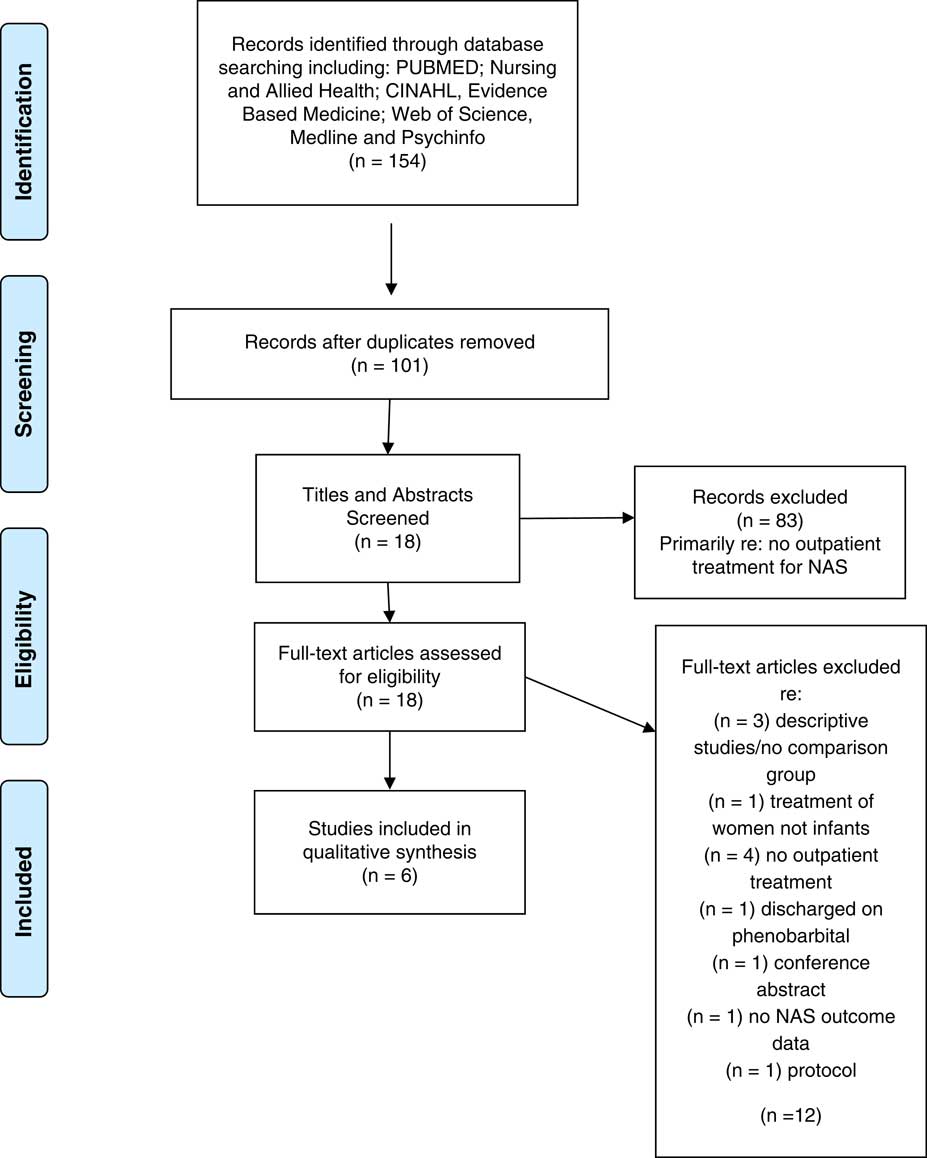 The search identified 154 studies, of which 18 provided information related to NAS and outpatient weaning. Further assessment of the inclusion and exclusion criteria eliminated 12 of the studies due to: descriptive studies/no comparison group (n=3); treatment of women not infants (n=1); no outpatient treatment (n=4); discharged on phenobarbital (n=1); no NAS outcome data (n=1); conference abstract (n=1); and published protocol (n=1). A total of six articles met all criteria and are included in the review. See Figure 1 for the flow diagram.