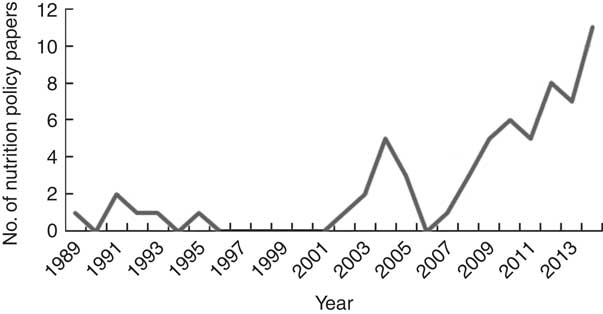 The publication of general nutrition policy papers and those utilising PPT has increased over time, with a greater concentration occurring post 2007, which is later than the increase post 1999 identified in the review of health promotion papers( Reference Breton and De Leeuw 34 ). This may be due to nutrition professionals becoming more aware of political science theories because more are being published in the general health promotion literature. Further, this heightened awareness of PPT may have led to increased opportunities for collaboration or inter-sectoral approaches on nutrition issues with political scientists. However, another reason is that there are increasingly more publishing options available for health policy papers. Fifty eight per cent of the journals cited for the current review were not in existence in 1986 and 30 % of the journals only came into being post 2000.