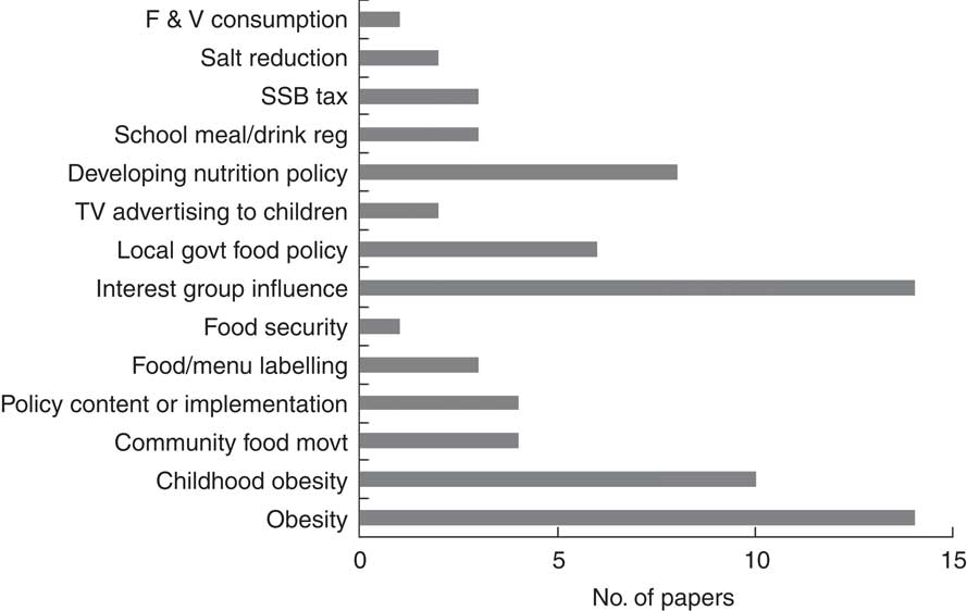 Fig. 3 Nutrition policy topics (F&V, fruit and vegetables; SSB, sugar-sweetened beverages; reg, regulations; TV, television; govt, government; movt, movement)