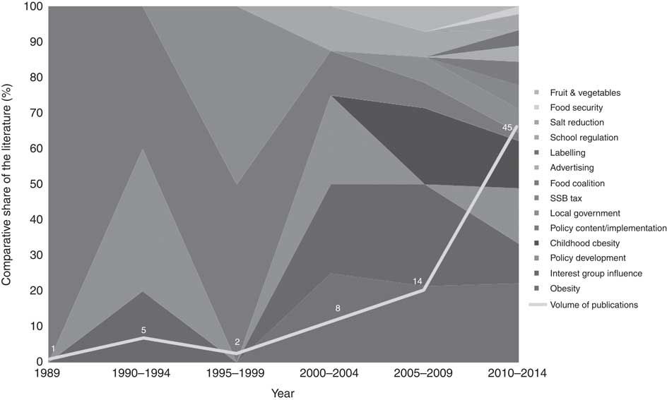 The topics covered in the nutrition policy papers were wide-ranging (see Fig. 3). Thirty-eight per cent of the papers focused on obesity, divided into general obesity (n 15, 24 %) and childhood obesity (n 9, 14 %). Other more common topics were interest group influence (n 14, 22 %), local government food policy (n 6, 9 %) and the process of developing nutrition policy (n 6, 9 %). The popularity of these topics has changed over time as can be seen in the ebb-and-flow analysis (Fig. 4). Earlier papers focused more on general policy content and implementation as well as school nutrition policy, whereas more recently there has been a stronger focus on obesity and the influence of interest groups in policy making. The ebb-and-flow analysis also illustrates the growing field of nutrition policy research and captures the fragmentation of the field as a wide variety of nutrition issues have become more salient over time.