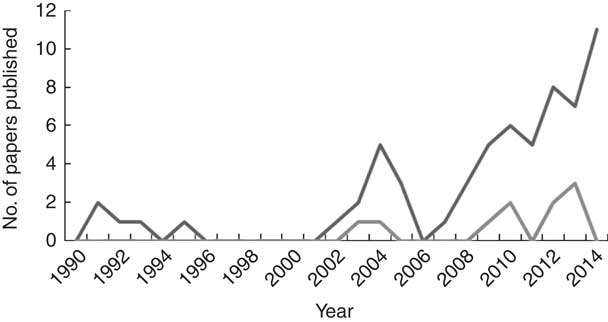 There has been an increase in the use of PPT in the reviewed nutrition policy papers in recent years (Fig. 5). However, this increase is fairly small with only 14 % (n 9) of all the nutrition policy papers reviewed using empirically tested PPT. In 2014 there appeared to be a reversal of the slight upward trend, with none of the nutrition policy papers utilising PPT to analyse the described policy process.