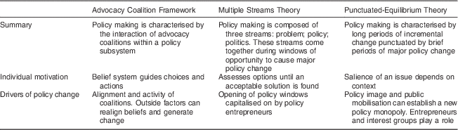 Conversely, the systematic study of the policy-making process has occurred in the field of political science since the 1950s, where many theories have been developed to explain the various components, including politics, process and power( Reference Sabatier 28 ). Applying political science policy process theories (PPT) retrospectively allows a greater understanding of why particular policy decisions were made, which can help advocates understand the complexities of the policy-making process as well as identify key actors and leverage points for power and influence in the process. An understanding of PPT can also aid in predicting the outcomes of ongoing or future initiatives( Reference Lapping, Frongillo and Studdert 29 , Reference Blanchet and Fox 30 ). Three commonly used PPT that have been validated empirically in multiple countries to explain and predict the policy-making process include the Advocacy Coalition Framework( Reference Jenkins-Smith and Sabatier 31 ), the Punctuated-Equilibrium Theory( Reference Baumgartner and Jones 32 ) and the Multiples Streams Theory( Reference Kingdon 33 ) (see Table 1 for a summary)( Reference Sabatier 28 ). These PPT have different components; they are, however, all theories of policy change which focus on agenda setting and policy adoption. Despite this raft of knowledge, very few public health experts utilise these empirically based PPT when analysing or trying to influence the policy-making process or the content of policies( Reference Breton and De Leeuw 34 – Reference Gilson and Raphaely 36 ). Publications in the public health policy area tend to focus on describing policy content and evaluating policy impact and outcomes, paying little attention to the policy-making process( Reference Bernier and Clavier 26 , Reference Macintyre 37 , Reference Catford 38 ).