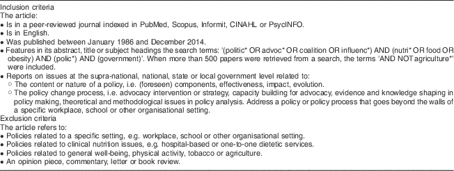 Table 2 Inclusion and exclusion criteria for the identification of journal articles reporting on policy research