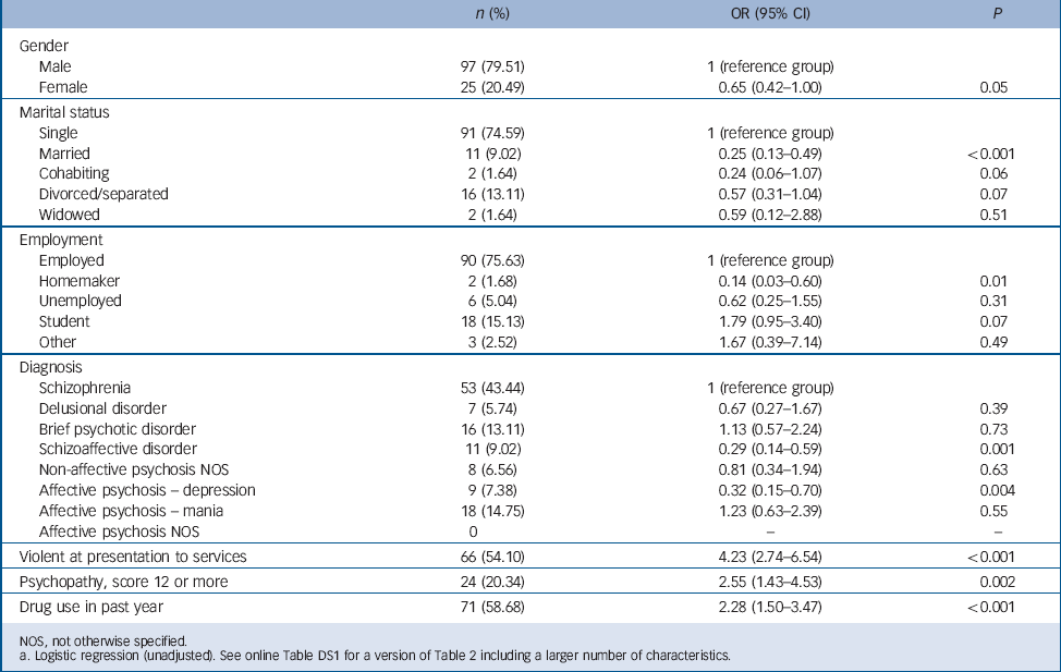 Table 2 shows the actual numbers of people and proportion of the total sample that have specific demographic, social and clinical characteristics (see online Table DS1 for a version of Table 2 that includes a wider range of characteristics). CJPs were more common among men rather than women, for violent presentations, for those who used drugs in the preceding year and for those with a higher level of psychopathy. CJPs were less common among women, married compared with single people, homemakers compared with employed people, those with a DSM-IV diagnosis of either schizoaffective disorder or affective psychosis (-depression) compared with those with a diagnosis of schizophrenia. Social factors including number of close people, a first referral by self or other people, alcohol use and insight were not significantly associated with CJPs; non-UK place of birth and having educational qualifications did not show statistically significant associations with CJPs.