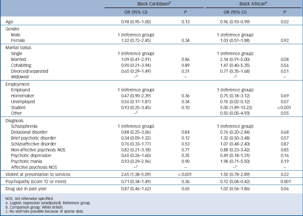 Table 3 shows associations of demographics (e.g. age, gender) and potential explanatory or mediating variables in the Black Caribbean and Black African ethnic groups, but only for variables that showed associations with CJPs in Table 2 as only these might be potentially mediating or explanatory variables. Violence at presentation was associated with Black Caribbean ethnicity and CJPs therefore it might be a mediator for the relationship between Black Caribbean ethnicity and CJPs. However, violence was not associated with Black African ethnicity and so it cannot mediate the higher risk of CJPs for patients in the Black African ethnic group. Although a psychopathy score, including criminal activity, of ≥12 was associated with CJPs (Table 2), a psychopathy score of >12 was less common among Black African patients, and so it could not explain the higher risk of CJP contact for Black Africans. A lower psychopathy level in Black Africans indicates that the risk of CJPs would be even higher if the experience of psychopathy was the same as for White British patients and Black Caribbean patients. As this could not explain the absence of association between violence and Black African ethnicity, further mediation analyses of the Black African group were not undertaken. Drug use in the previous year was not associated with Black Caribbean or Black African ethnicity and so cannot be a potentially mediating or explanatory variable for associations between ethnic group (Black Caribbean or Black African compared with White British patients) and CJPs. Diagnoses were associated with CJPs, but not with ethnic group and therefore cannot operate as potentially mediating or explanatory variables.