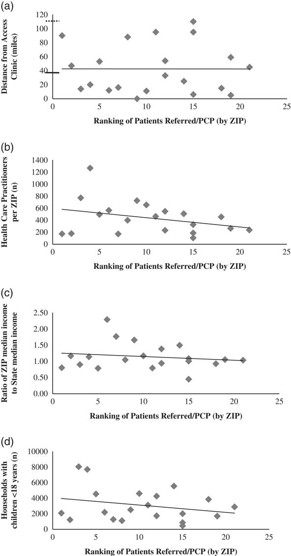 Distance between ZIP codes and the Access Clinic were obtained from www.googlemaps.com. Census data on population, households with children <18, median income, and number of health practitioners per ZIP code were obtained from www.factfinder2.census.gov. ZIP code data for referring PCP offices were stratified into quartiles by ranking the number of patients referred per PCP. We reported the top quartile.