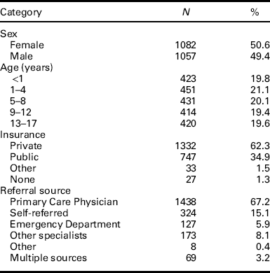 Patients were majority female; aged <1–17 years distributed in quintiles of four-year increments above age 1 (Table 1). A total of 62.3% of families were privately insured. Of the 2139 new outpatients, 1438 (67.2%) were referred by their PCP.