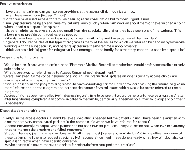 The primary aim of the study is to examine stakeholder perceptions. Referring PCPs are satisfied with the Access Clinic due to shorter wait times and high quality care. The PCP is referring to a ‘generalist-as-specialist,’ not another PCP (Sharif et al., Reference Sharif, Gartner, Plesnick and Greenspan2012). PCPs are comfortable with which patients to refer and are satisfied with the Access Clinic. Many PCP comments and survey responses (Table 2) regarding the care their patients experienced provide constructive feedback with themes of family preference, AP expertise, timely care delivery, and bi-directional communication.
