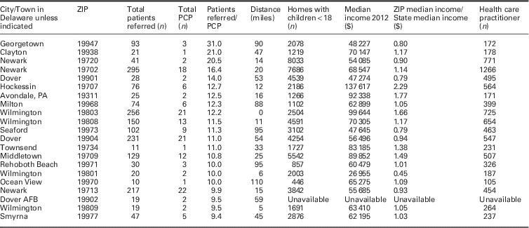The five ZIP codes with the most patients referred corresponded to suburban population centers (Table 3, column 3). The ZIP code where the Access Clinic is located, 19803, represented 25.7% of patients. Examining the next five ZIP codes with the most patients referred, the average distance traveled was 25 miles (range 11–54 miles, median 20 miles, and IQR 10 miles). The five ZIP codes with the most referrals per PCP corresponded to five different urban and suburban population centers (average 21 patients/PCP, range 14–31, median 20.5, IQR 4.6; Table 3, columns 3–5). The average distance traveled from the five ZIP codes was 44.8 miles (range 14–90 miles, median 47 miles, IQR 33 miles; Table 3, column 6).