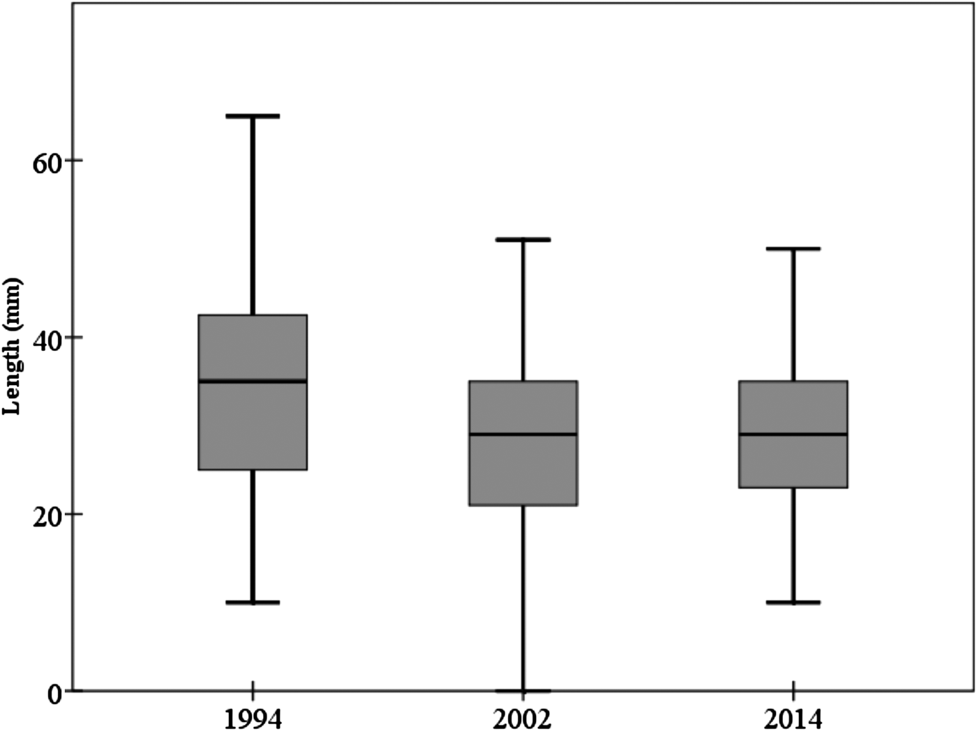 A comparative study, using individual sizes, was conducted using the current data collected in 2014 and previous data from 1994 (Nuñez et al., Reference Nuñez, Barquin and Brito1994) and 2002 (Espino & Herrera Reference Espino and Herrera2002). Spatial variability was also considered, grouping sampling locations together depending on their shore orientation and thus accessibility to the coast (North (<100 days accessible), East (200–250 days accessible) and Western (>300 days accessible)).