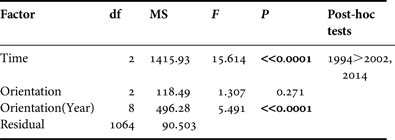 A multivariate comparison of the sizes of abalones was conducted using an analysis of variance (ANOVA). Despite the heterogeneity of the variances (Levene's test), the increase of type I error was avoided by reducing the P value to 0.01 level (Underwood, Reference Underwood1991). The factors ‘Time’ and ‘Orientation’ were included in the comparative study (1994–2002–2014). The Scheffé test was used for post-hoc procedures. All multivariate procedures were carried out using the SPSS 17.0 statistical package.