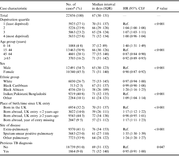 The overall median interval to start of treatment for the population was 67 days (IQR 30–131). The interval was similar among those living in the four deprivation quartiles, although slightly longer among the least deprived and most deprived compared to those in the middle two quartiles. Longer intervals were experienced by older patients, females, those of white ethnicity, those born in the United Kingdom or born abroad with UK entry ⩾2 years prior to TB diagnosis, patients with extra-pulmonary disease, and those with a previous TB diagnosis (Table 1).