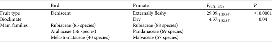 We analysed the variation of traits between endozoochorous and non-endozoochorous species, and between species displaying a primate and a bird syndrome (following the definitions above). We fitted models using generalized least squares and maximizing the log-likelihood, with traits as dependent variables and syndrome as an independent variable, and compared them to null models using the likelihood-ratio test. We used the function anova combined with the function gls in the nlme package (Pinheiro et al., Reference Pinheiro, Bates, DebRoy and Sarkar2016). We performed all analyses in R v. 3.3.1. Data on traits of endemic Madagascan plant species before and after imputation of missing values are available from the Dryad Digital Repository: http://dx.doi.org/10.5061/dryad.dt940.