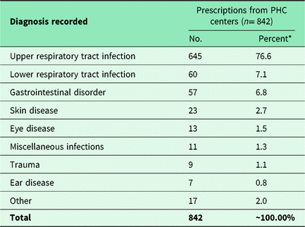 In our study, the most frequent diagnosis recorded in prescriptions was upper respiratory tract infection that corresponds with another study conducted among PHCCs in Saudi Arabia in which 51.2% of the diseases recorded on prescriptions were upper respiratory tract infections (Neyaz et al., Reference Neyaz, Khoja, Qureshi, Magzoub, Haycox and Walley2011). Another study reported acute respiratory tract infections (53.7%) as the most common diagnoses among children at the outpatient clinic (Fadare et al., Reference Fadare, Olatunya, Oluwayemi and Ogundare2015).