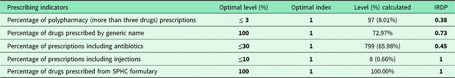 The index of rational drug prescribing (IRDP) consists of five indices derived from the WHO drug prescribing indicators (Dong et al., Reference Dong, Yan and Wang2011). Table 1 displays the optimal level for each indicator. Each indicator has an optimal index of 1. Drug prescribing is considered more rational for the values of calculated index closer to 1. In our study, the prescriptions with three or more medicines were considered as polypharmacy. The generic name index and essential medicine index were measured by the percentage of drugs prescribed by generic name and from the SPHC formulary, respectively. The index of rational antibiotic prescribing was defined as dividing the optimal level (30%) by the percentage of prescriptions including an antibiotic. The index of prescribing injection was calculated by dividing the optimal level (10%) by the percentage of prescriptions including the injection. The IRDP with a maximum value of 5 was calculated by adding the indices.
