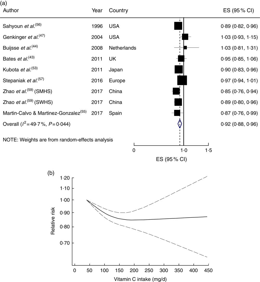 Fig. 1 (a) Forest plot showing relative risk of cardiovascular mortality for a 50 mg/d increment in vitamin C intake. The study-specific effect size (ES) and 95 % CI are represented by the black square and horizontal line, respectively; the area of the black square is proportional to the specific-study weight to the overall meta-analysis. The centre of the blue open diamond and the vertical dashed line represent the pooled ES, and the width of the blue open diamond represents the pooled 95 % CI (SMHS, Shanghai Men’s Health Study; SWHS, Shanghai Women’s Health Study). (b) Dose–response association of vitamin C intake and risk of total cardiovascular mortality (———), with 95 % CI (— — —)