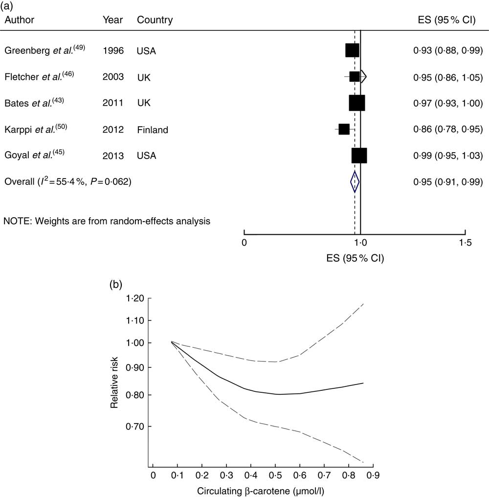 Fig. 6 (a) Forest plot showing relative risk of cardiovascular mortality for a 0·10 µmol/l increment in circulating β-carotene concentration. The study-specific effect size (ES) and 95 % CI are represented by the black square and horizontal line, respectively; the area of the black square is proportional to the specific-study weight to the overall meta-analysis. The centre of the blue open diamond and the vertical dashed line represent the pooled ES, and the width of the blue open diamond represents the pooled 95 % CI. (b) Dose–response association of circulating β-carotene concentration and risk of total cardiovascular mortality (———), with 95 % CI (— — —)