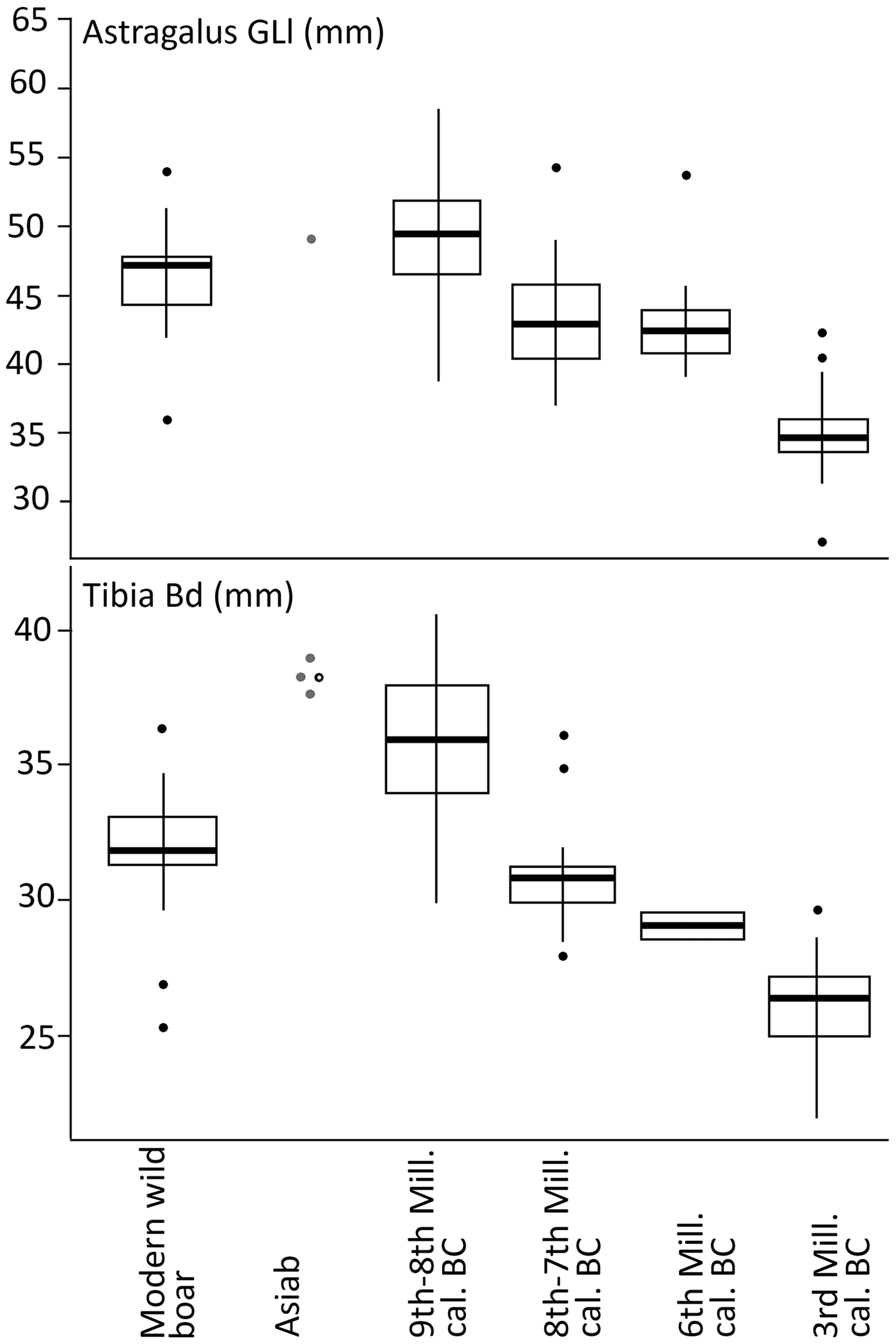 Figure 6. Comparison of the measurements taken on Suidae tibiae and astragali to long term changes in size shown by Price and Evin (Reference Price and Evin2019) to include the Asiab data from the new excavation in black with white central dot and that published by Bökönyi (Reference Bökönyi1977) in grey.
