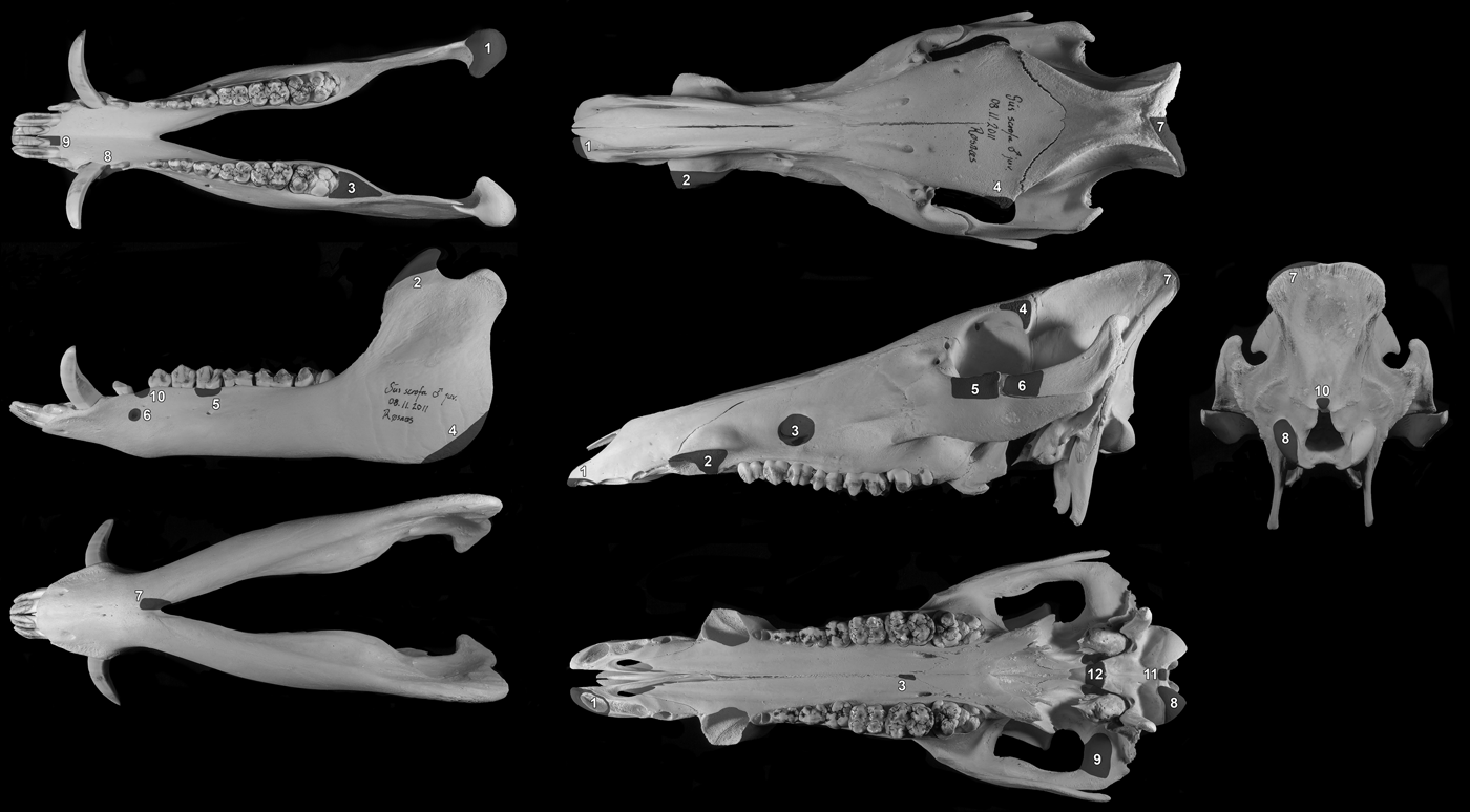 Figure 8. Zones of the mandible and crania used to quantify the completeness of the skulls and calculate the minimum number of individuals (MNI).