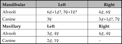 Table 5. Male and female canines and alveoli for the canines present excluding canine fragments that were less than half of the original tooth.