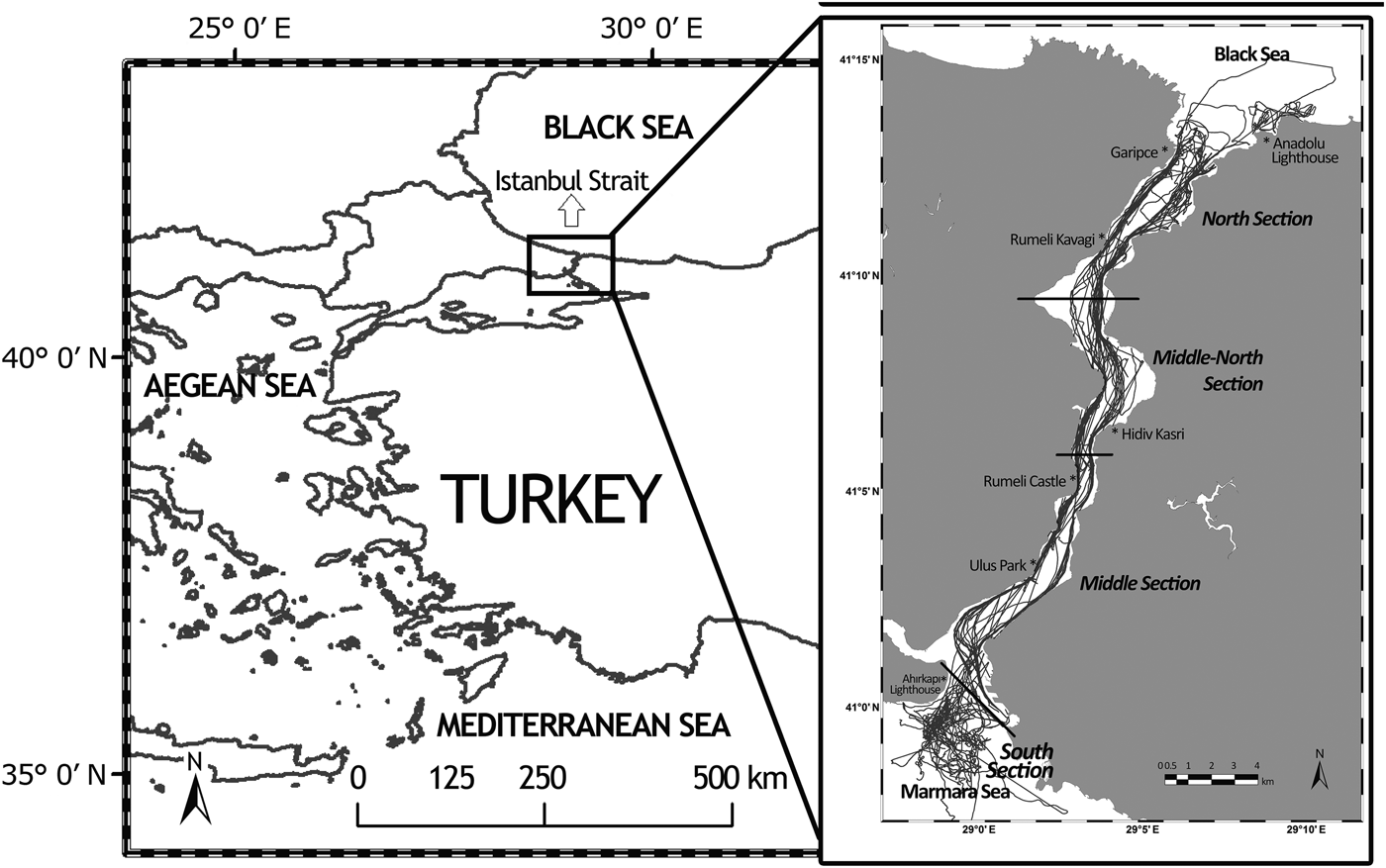 The Istanbul Strait is well known for its cultural, strategic and economic importance. It is the only waterway connecting the Black Sea and Marmara Sea. It is one of the narrowest and busiest straits in the world with a minimum distance of 698 m between the European and Asian coasts (Özsoy et al., Reference Özsoy, Çagatay, Balkıs and Öztürk2016). The annual number of marine vessels travelling through the Istanbul Strait was ~4500 in 1936. This figure had increased dramatically to 45,529 marine vessels passing through the strait in 2014 (Kara, Reference Kara2016). The average number of cargo ships is estimated to be around 130 per day, while daily local traffic accounts for ~1200 vessels (Directorate General of Coastal Safety, 2014). In addition, fishery is an important industry in Turkey, with the Istanbul Strait being the second most important fishery region after the East Black Sea Region (TUIK, 2016). Both small-scale artisanal fisheries and large-scale commercial fisheries are active in the area. Thirteen fishery cooperatives and 17 fishing ports are located in the strait, with 14 of the 17 ports located in the north section alone (Öztürk et al., Reference Öztürk, Karakulak, Öztürk, Oral and Öztürk2006). While artisanal fishery is utilized throughout the strait all year round, the northern sections are subjected to intense purse seining from September to mid-April. Although the current study was not specifically focused on fisheries, substantial numbers of commercial fishing vessels were recorded with an average of 100 vessels daily, during autumn and winter in the middle and north sections. Sometimes more than 50 vessels could be sighted at a time (Baş et al., Reference Baş, Öztürk and Öztürk2015).