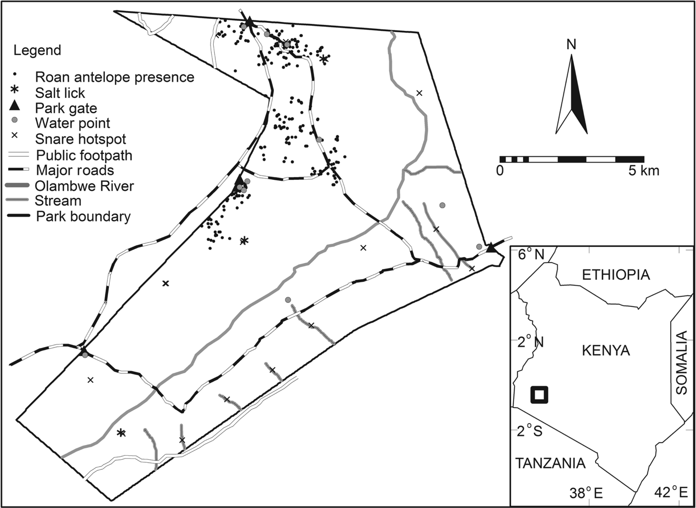 Studies have shown that hunters target different species depending on their main reason for hunting (subsistence or commercial), animal body size and species’ abundance (Noss, Reference Noss1998; Fa et al., Reference Fa, Ryan and Bell2005). Snare hunting tends to overexploit the most common species (Noss, Reference Noss1998), and therefore the density of snares is predicted to be high in areas with a high density of targeted species. As most herbivores prefer habitats of low to moderate slope and elevation (Kimanzi, Reference Kimanzi2011) hunters may lay more snares in such areas. Hunters may also use their indigenous knowledge about suitable habitats for targeted species when placing snares (Gadgil et al., Reference Gadgil, Berkes and Folke1993). For example, many snares may be set in burned vegetation to target grazers attracted by the fresh grass that sprouts after fires. There may also be a higher density of snares in grasslands than non-grasslands if poachers are targeting grazers. Water and salt licks are essential resources for many wildlife species, and therefore setting snares in areas close to these resources could be rewarding for hunters. To avoid being caught, hunters may lay snares away from gates and outposts and relatively near the edge of the Park so that they can escape if they encounter rangers on patrol. Knowing how snaring patterns correlate with the road network in the Park can help rangers to ascertain whether vehicle patrols are deployed effectively or whether they need to be combined with foot patrols (Arcese et al., Reference Arcese, Hando, Campbell, Sinclair and Arcese1995).