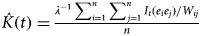 $\hat K(t) = {\textstyle{{\lambda ^{ - 1} \sum _{i = 1}^n \sum _{\,j = 1}^n I_t (e_i e_j )/W_{ij}} \over n}}$