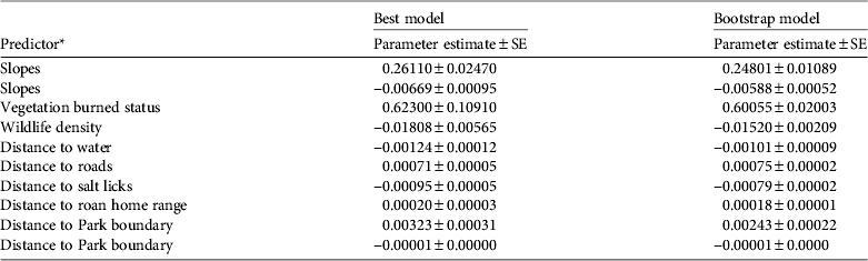 Table 1 Predictive model results (best and bootstrap) for 10 variables, based on negative binomial regression for the distribution of snares in Ruma National Park, Kenya (Fig. 1).