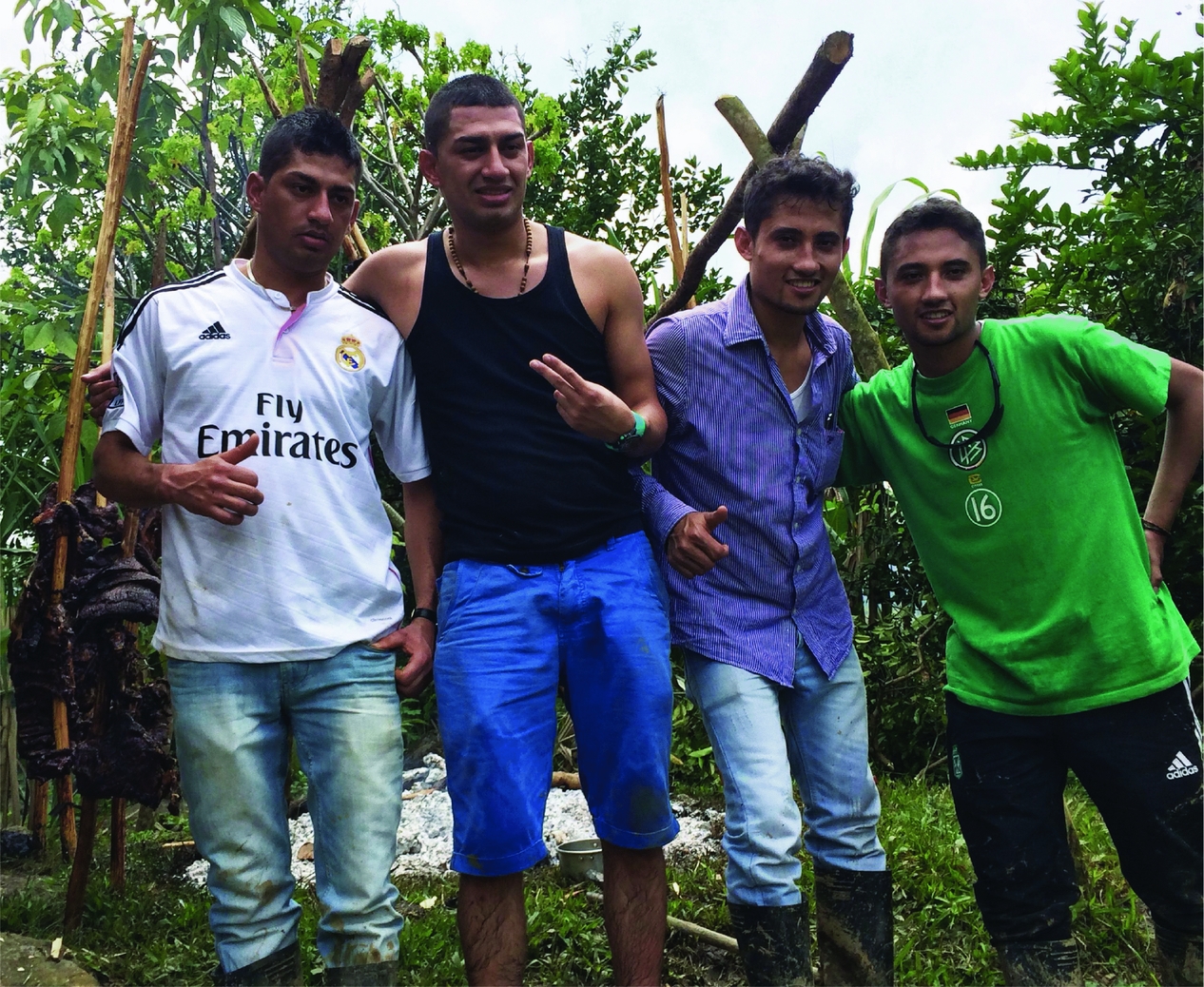 FIGURE 1 The four Colombian twins at a family gathering in the country, March 2015. The members of one MZA twin pair are the first and second from the left; the members of the other MZA twin pair are third and fourth from the left. Photo credit: Dr. Nancy L. Segal.