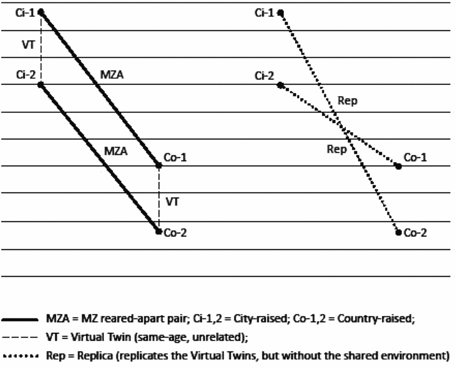 The better educated city-raised twins outscored their country-raised co-twins. The co-twins in one MZA pair were at items 34 and 24, respectively, after 42 min had elapsed, whereas the co-twins in the other pair completed the test in less than 42 min. Members of the unrelated pairs (VTs) scored closer to one another than to their reared-apart co-twins. Interestingly, the degree of difference between the two MZA pairs and the two VT pairs was about the same. The biggest difference among the six pairings was between one of the replicated pairs, followed by the two MZA twin pairs. These findings are shown graphically in Figure 2.