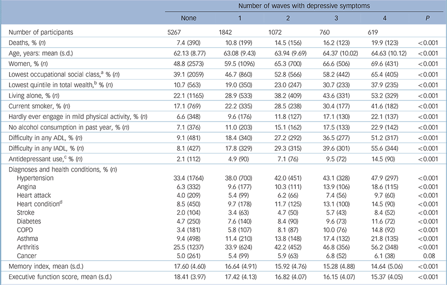 In Table 1, we have shown the baseline characteristics of participants according to the number of waves that they recorded a CES-D score ⩾3. The prevalence of people classified as a case based on the reporting of depressive symptoms on 1, 2, 3 and 4 waves was 19.3% (n = 1842), 11.2% (n = 1072), 7.9% (n = 760) and 6.5% (n = 619) respectively. In general, relative to those without depressive symptoms, people who reported a longer duration with depressive symptoms had markedly less favourable characteristics. Study participants reporting a longer duration with symptoms were more likely to be women, older, employed in a routine occupation, be less wealthy, live alone, report a functional impairment, be a current smoker, hardly ever engage in physical activity, not consume alcohol in the past year and report having a health condition (with the exception of cancer).