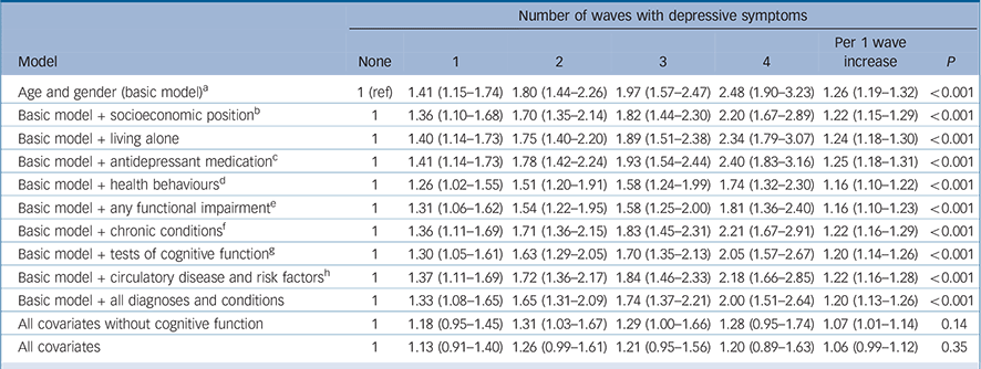 We conducted a number of sensitivity analyses. To address concerns that somatic complaints brought about by physical disease were a confounding factor, we recalculated totals for CES-D scores across the four waves after removing the three items relating to somatic symptoms. As another cohort of older adults had defined elevated depressive symptoms on the CES-D using a threshold of ⩾4, Reference Steffick18 we reran our analysis using this threshold. We examined all 16 permutations of duration (e.g. one wave was 1000, 0100, 0010 and 0001) and included deaths that occurred during the assessment of depressive symptoms. Due to the possibility of left-censoring of duration, whereby participants could enter the study having had depression for many years, we excluded participants with depressive symptoms at wave 1. As there is evidence that poor cognitive function predicts drop-out in longitudinal studies with older adults, Reference Weir, Faul and Langa19 we reran the analyses after excluding participants who scored in the lowest quartile on measures of cognitive function. Then, to explore the possibility of reverse causality (whereby imminent death/terminal illness may increase symptoms of depression), we conducted a subgroup analysis by excluding all participants who died within 12 months after the final wave in 2008–2009 (n = 250). All analyses were carried out using Stata Version 13.0 (StataCorp LP, College Station Texas).