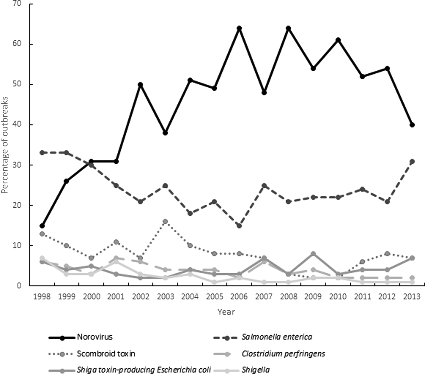 Fig. 2. Percentage of restaurant-associated outbreaks caused by the most common confirmed aetiologies, by year, Foodborne Disease Outbreak Surveillance System, 1998–2013.