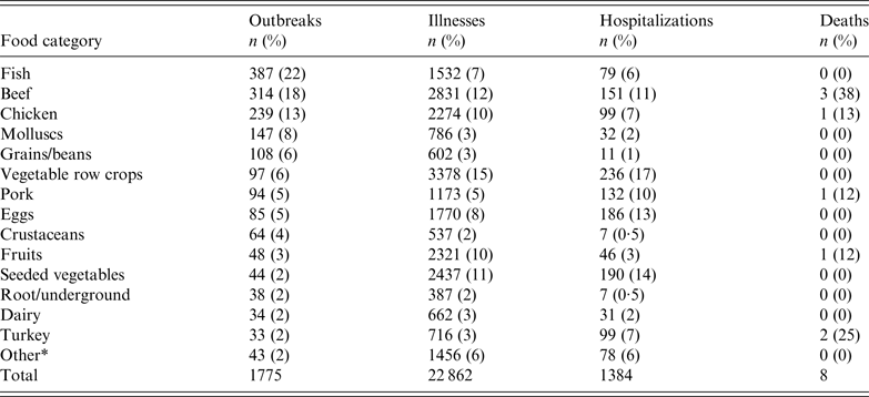 A food was implicated in 4102 (42%) outbreaks. Of these, 1775 (43%) had a food that could be assigned to a single category, most commonly fish (387 outbreaks, 33%), beef (314 outbreaks, 27%), chicken (239 outbreaks, 20%), and molluscs (147 outbreaks, 13%) (Table 1).