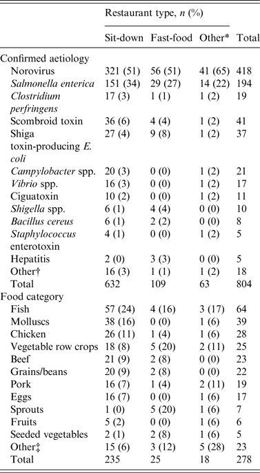 Of the 1859 single restaurant-associated outbreaks reported from 2009 to 2013, 1463 (79%) were at sit-down dining establishments and 246 (13%) were at fast-food establishments. Of the 804 outbreaks with both a restaurant type and a confirmed aetiology, norovirus outbreaks associated with sit-down restaurants were most common (321, 40%) (Table 3). Of the 278 outbreaks with both an implicated food category and information on restaurant type available, fish (57 outbreaks), molluscs (38 outbreaks), and chicken (26 outbreaks) were the most common foods associated with sit-down restaurants, and vegetable row crops and sprouts were most common in fast-food restaurants (five outbreaks each) (Table 3). Certain foods were more frequently implicated in sit-down than fast-food restaurants, including eggs (8% of outbreaks in sit-down dining restaurants vs. 0% in fast-food restaurants), pork (8% vs. 4%), molluscs (18% vs. 0%), chicken (12% vs. 4%), and fish (27% vs. 16%).