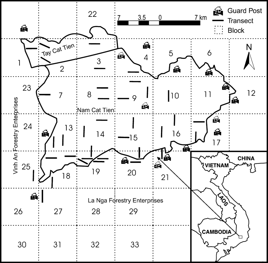 Fig. 1 Cat Tien National Park and surrounding areas, with the location of guard posts, transects and numbered survey blocks. The inset shows the location of the Park in Vietnam.