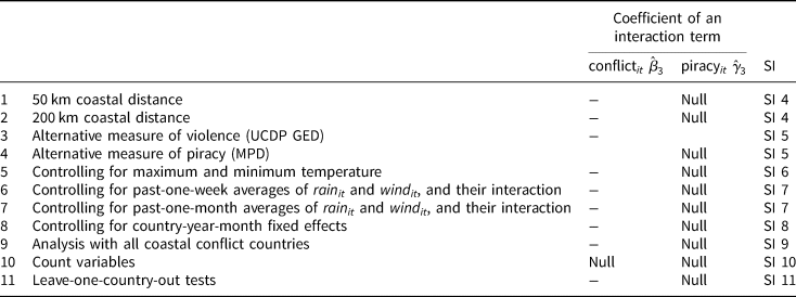 I also conduct a series of robustness checks, which is summarized in Table 3. My main findings hold in most of the robustness checks. The results are robust to different thresholds for coastal areas and seas (SI 4), alternative datasets of violence and piracy (SI 5), the control for minimum and maximum temperature (SI 6), different time-windows for the lagged predictors (SI 7), the inclusion of country-year-month fixed effects, which account for any unobserved confounders that change across months (SI 8), the inclusion of countries that have zero variance in the outcome variables (SI 9), and leave-one-country-out tests (SI 11).