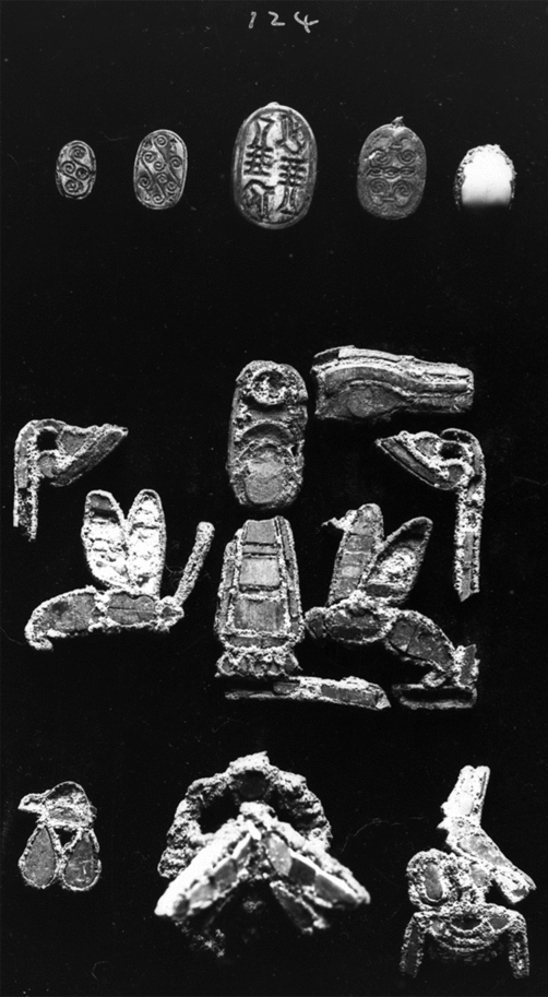 Figure 1. Inlaid jewellery from Harageh tomb 124 (UCL Petrie Museum of Egyptian Archaeology negative 1055).