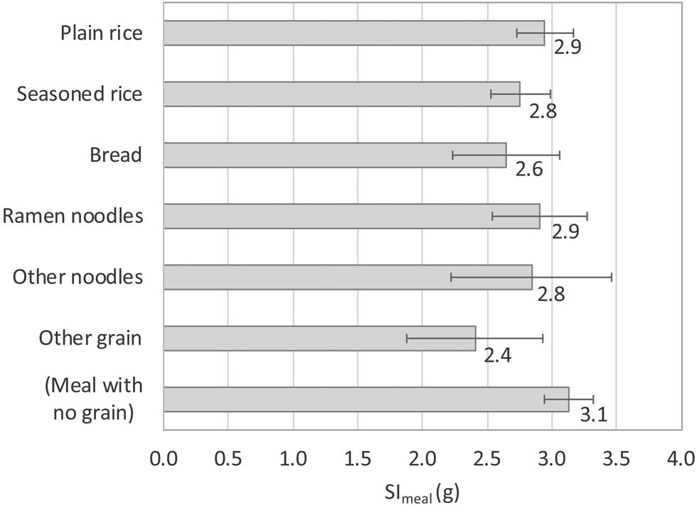 Fig. 1. Estimated salt intake per meal (SImeal) for each category of grain dishes. The values beside each bar denote point estimates, and the error bars indicate the 95 % confidence intervals.