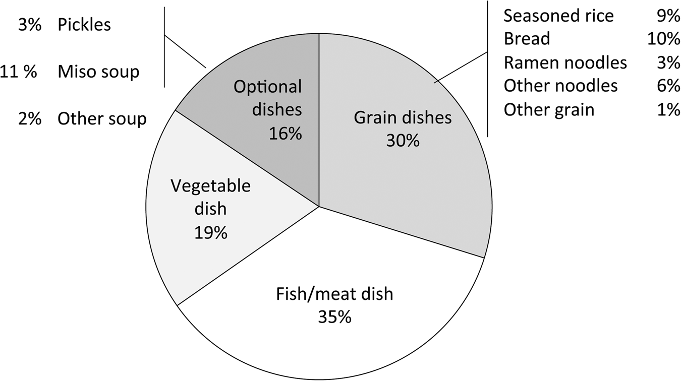 We collected and analysed dietary records based on two ideas. First, we used dishes – rather than nutrients or foods – as meal components to analyse repeated dietary records and intelligible deliverables. Second, we placed importance on grain dishes. A variety of grain dishes are staples in the Japanese diet, including rice, bread, noodles and wheat flour. The selection of a grain dish markedly influences the composition of a given meal. For example, plain rice is normally accompanied by several optional dishes, while bread is rarely combined with miso soup. Therefore, we classified grain dishes into subcategories and regarded them as the major determinants of other dishes.