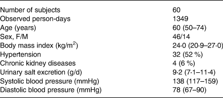 The present study involved seventy-nine participants from the intervention group for whom urinary salt excretion was measured. Among these participants, sixty whose dietary records of three meals a day (including skipped meals) and daily salt excretion values were both available for at least 15 d during the 1-month study period were analysed. The participant flowchart is shown in Supplementary Fig. S1.