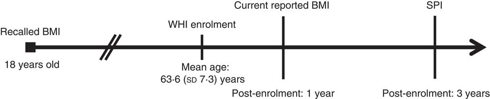 Fig. 1 BMI and severe physical impairment (SPI) assessment timeline among Women’s Health Initiative (WHI) participants, depicting when measures used to calculate BMI and SPI were collected