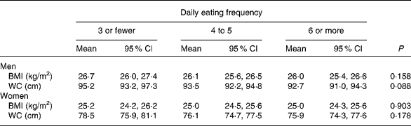 Table 4 BMI and waist circumference (WC) among men (n 892) and women (n 1024) in categories of daily eating frequency adjusting for potential confounders*