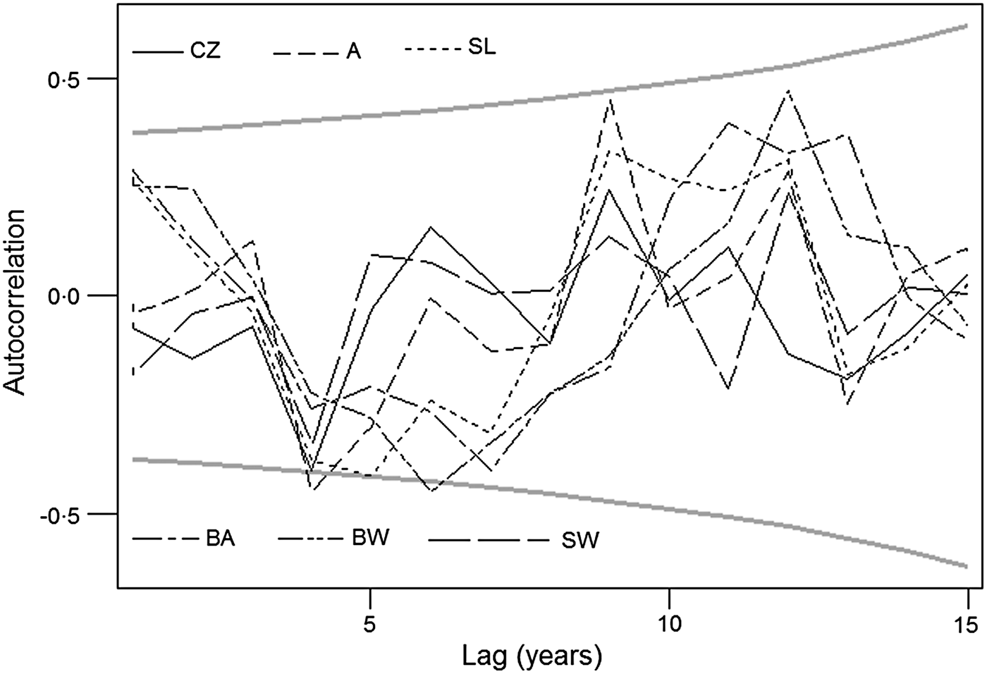 Fig. 7. Autocorrelation of the six de-trended tick-borne encephalitis incidence series; 95% confidence limits of randomness are shown in grey. Note that maxima and minima of the disease incidence alternate about every 5 years (range ~4–7 years). CZ, Czech Republic; A, Austria; SL, Slovenia; BA, Bavaria: BW, Baden-Württemberg; SW, Switzerland.