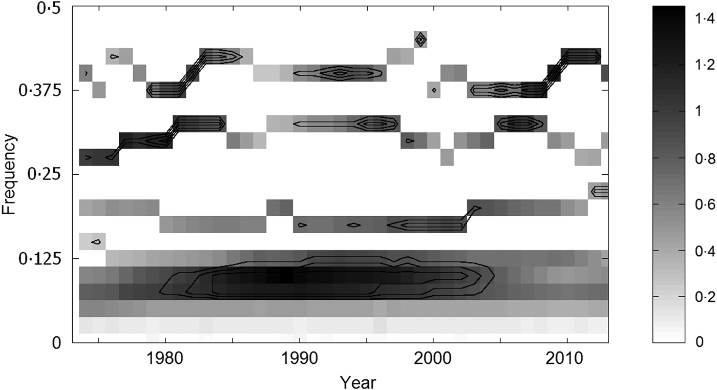 Fig. 8. Time-frequency (multivariate synchrosqueezing method) localization of the oscillations which the six regional tick-borne encephalitis incidence series exhibit in common; grey tones correspond to the degree to which the oscillations are synchronized, and the concentric lines indicate the respective (from outer to inner) 80%, 90%, and 95% levels at which randomness can be excluded (based on 100 (×6) Monte Carlo simulations of the series under H0). Note four bands – common oscillations of the wavelengths varying around 2·5, 3·2, 5·3, and 10·5 years, respectively.