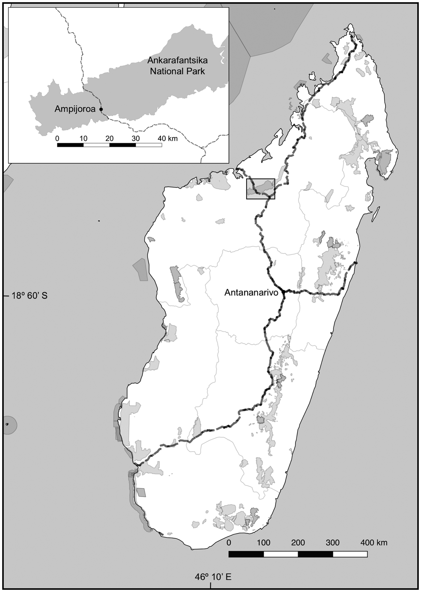 Fig. 1 Major national highways (dashed lines) and protected areas (grey shading) in Madagascar. The inset shows the division of Ankarafantsika National Park by Route Nationale 4 (RN4) into areas of c. 17,500 and 78,000 ha.