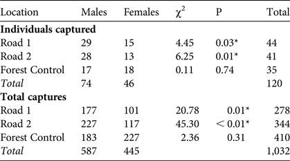 Table 1 Number of individuals captured (individuals identified and given a unique ID) and total number of captures (including recaptures) of golden-brown mouse lemurs Microcebus ravelobensis at the Road 1 (connection across RN4), Road 2 (no connection across RN4) and Forest Control (interior forest with no barrier) sites in the Ampijoroa Forest Reserve within Ankarafantsika National Park, Madagascar (Fig. 1), with χ2 and P (* denotes significance at P < 0.05).