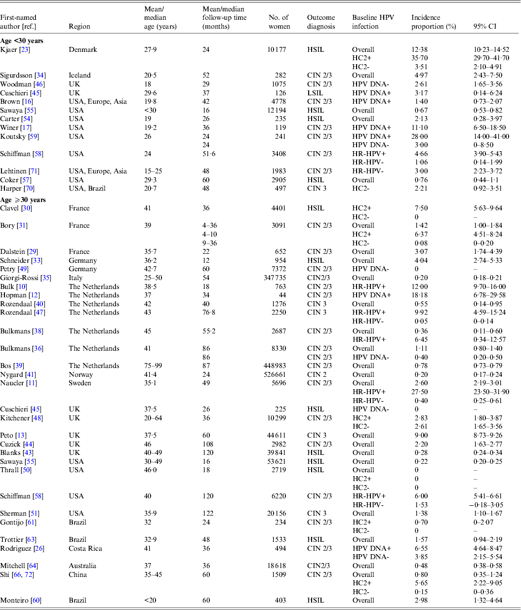 Abstracted data included (i) incidence proportion (equivalent to cumulative incidence) with associated standard errors or confidence intervals (CIs), and (ii) time interval over which incidence was measured. Study information abstracted included first author, publication journal and date, country and city of the study, period in which study was conducted, characteristics of study population (e.g. attendees of organized or routine cytological screening), mean, median or age range of study population, study exclusion criteria (e.g. current pregnancy, past hysterectomy), sample size (number of women screened), baseline cervical status, cervical cancer diagnostic method used at baseline, baseline HPV DNA or serology prevalence or type, HPV testing method [polymerase chain reaction (PCR) or hybrid capture 2 (HC2)], PCR primers if available (MY09/11, GP5+/6+, SPF-10, etc.), mean/median time of follow-up, and final diagnosis of cytological [ASCUS, low-grade squamous intraepithelial lesion (LSIL), or high-grade squamous intraepithelial lesion (HSIL)] and/or histological (CIN 1, 2 or 3) lesions. Abstracted data were double-checked by two independent investigators (H.S. and X.S.) and any discrepancies were resolved by consensus.