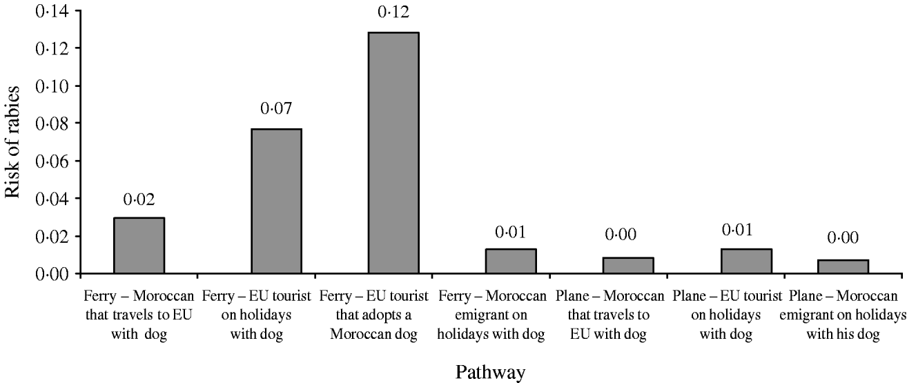 The fact that the main contributors to the total likelihood of rabies introduction into the EU from Morocco were EU citizens that adopted a dog in Morocco (59% of the total probability) is in agreement with what actually occurred [6, 11]. On the other hand, EU citizens that travelled to Morocco with their dog by ferry were responsible for 34% of the total probability, while the contribution of the rest of the pathways was much more limited.